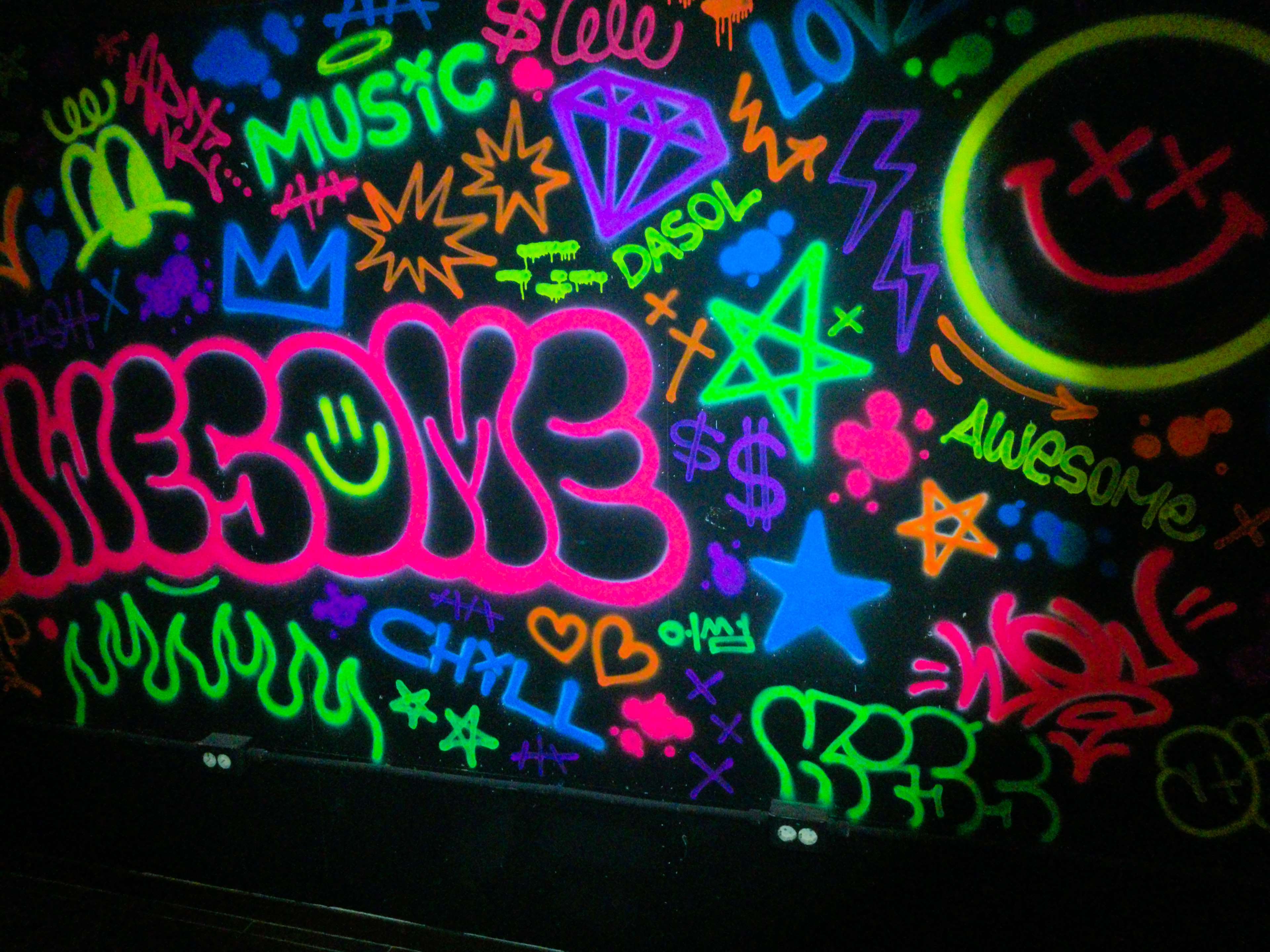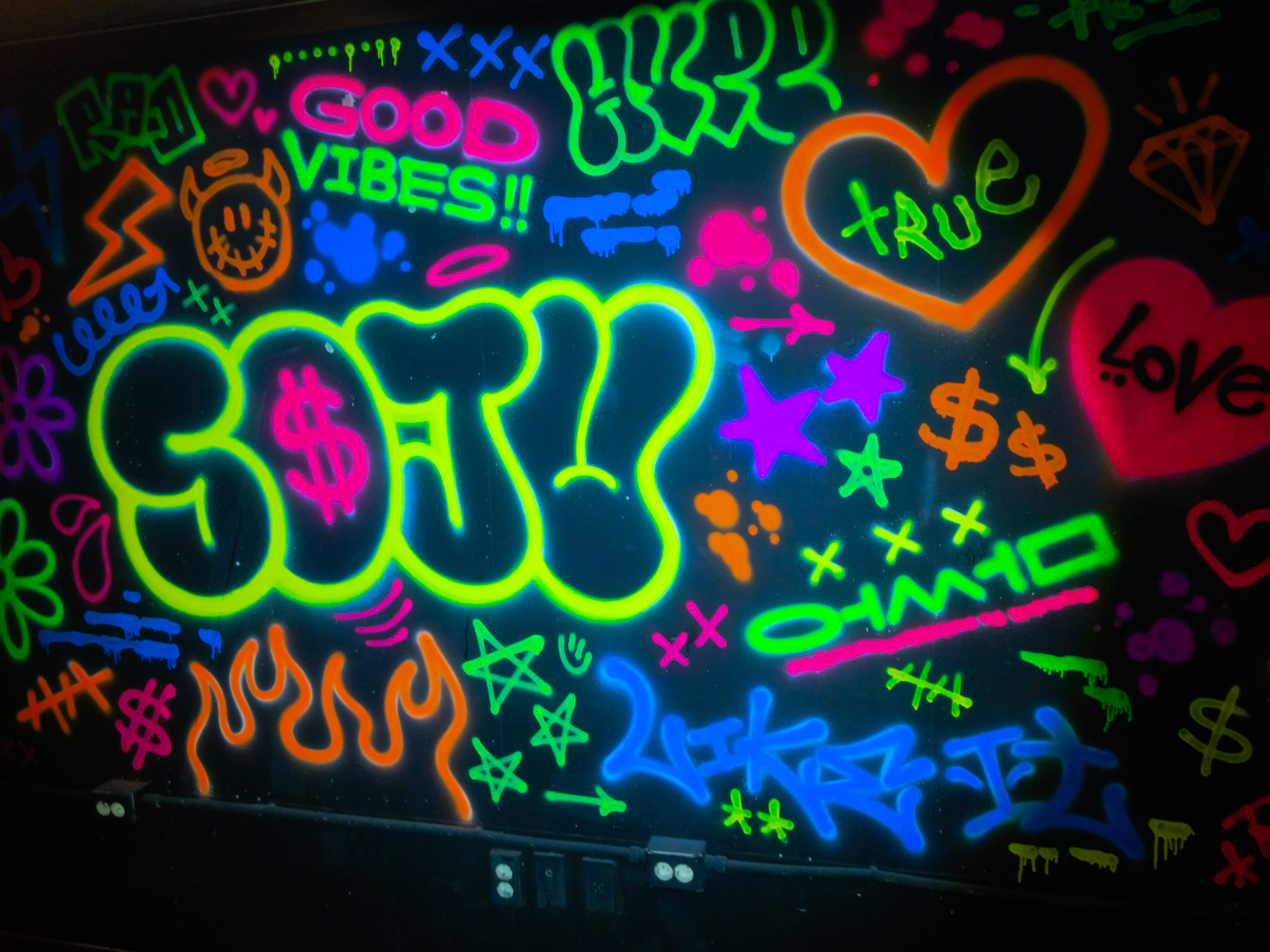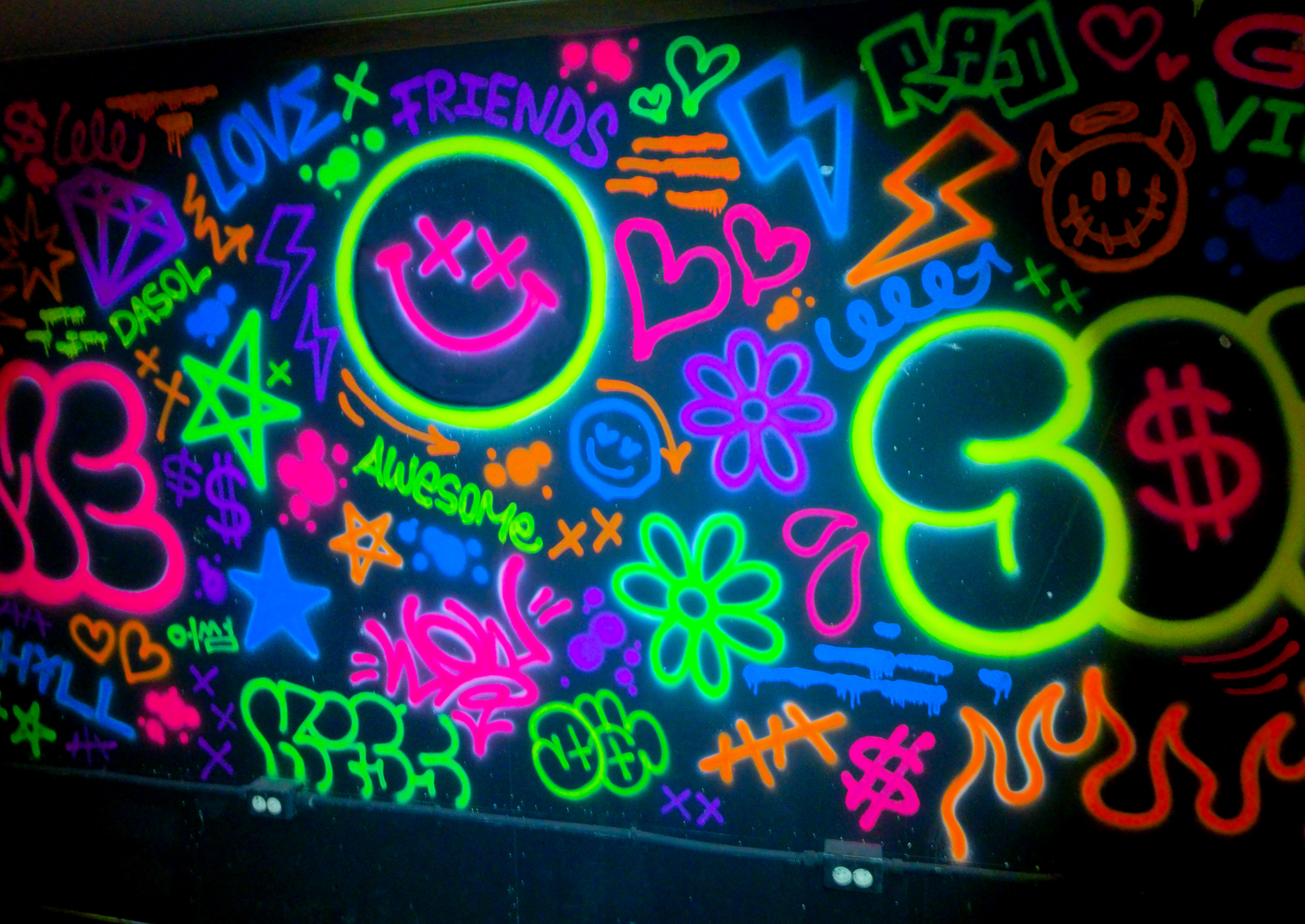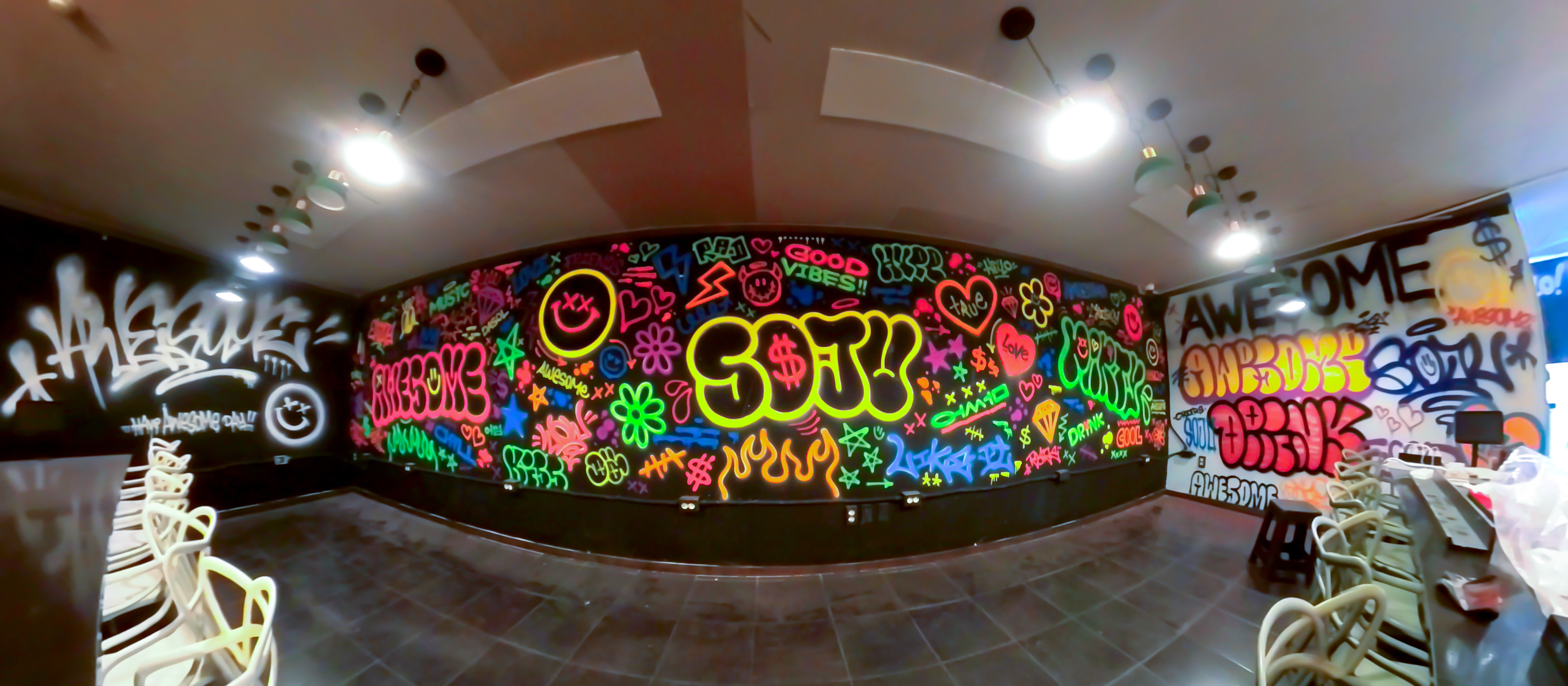 메인 벽면에는 형광 스프레이 작업을, 사이드 벽면에는 낙서 스타일의 작업을 진행했습니다😈💕