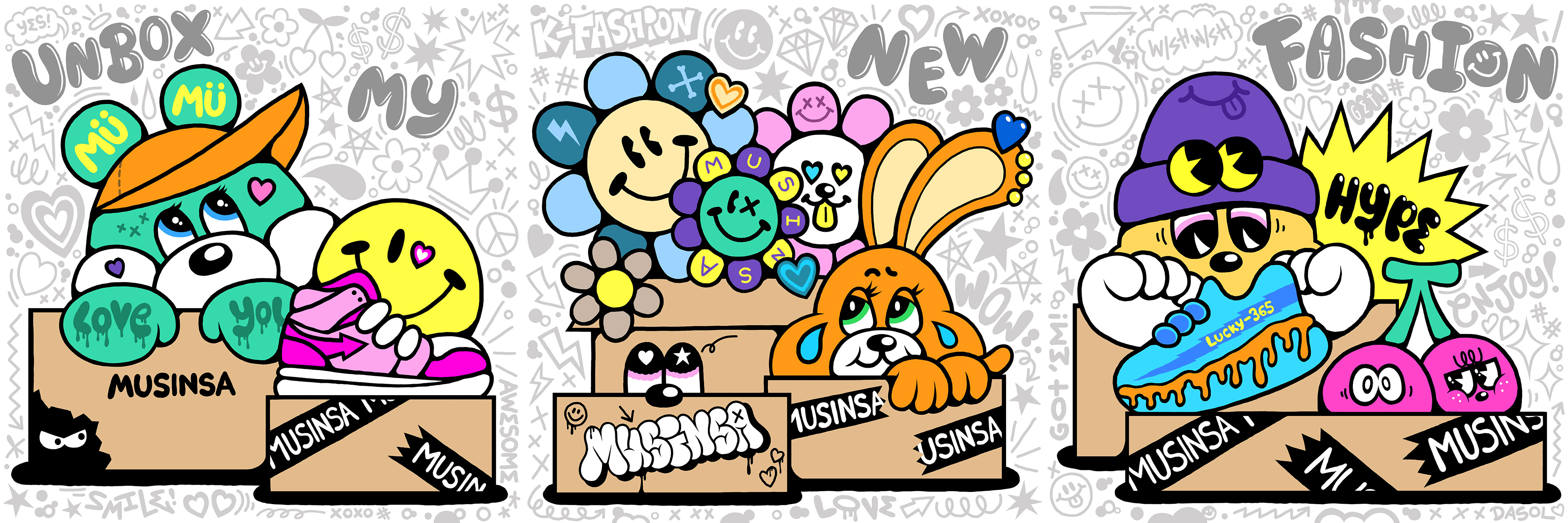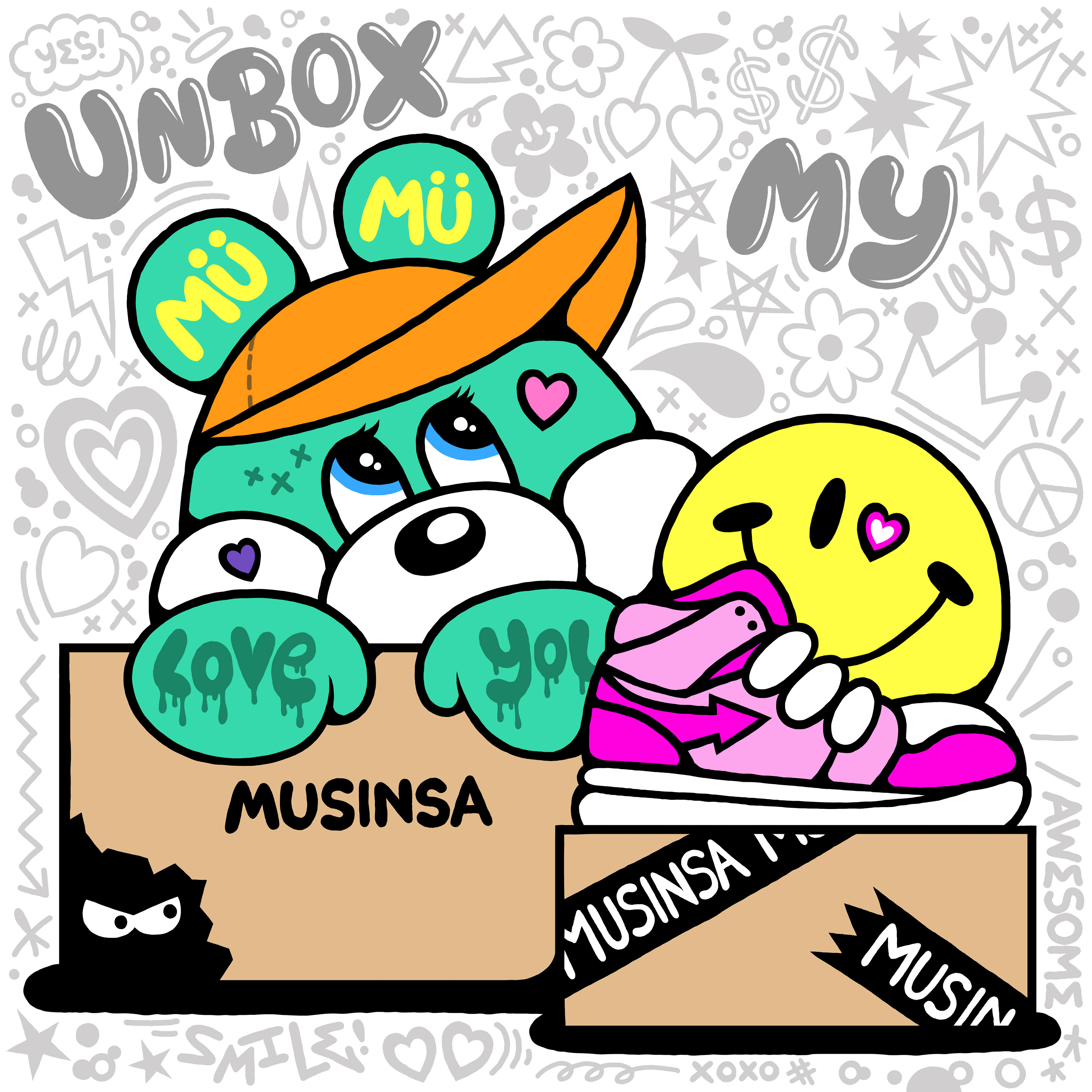 박스 안에 다양한 캐릭터가 함께하는 모습을 통해 <다양한 형태의 행복과 설레임이 담겨있는 MUSINSA BOX>를 표현하고자 했습니다.