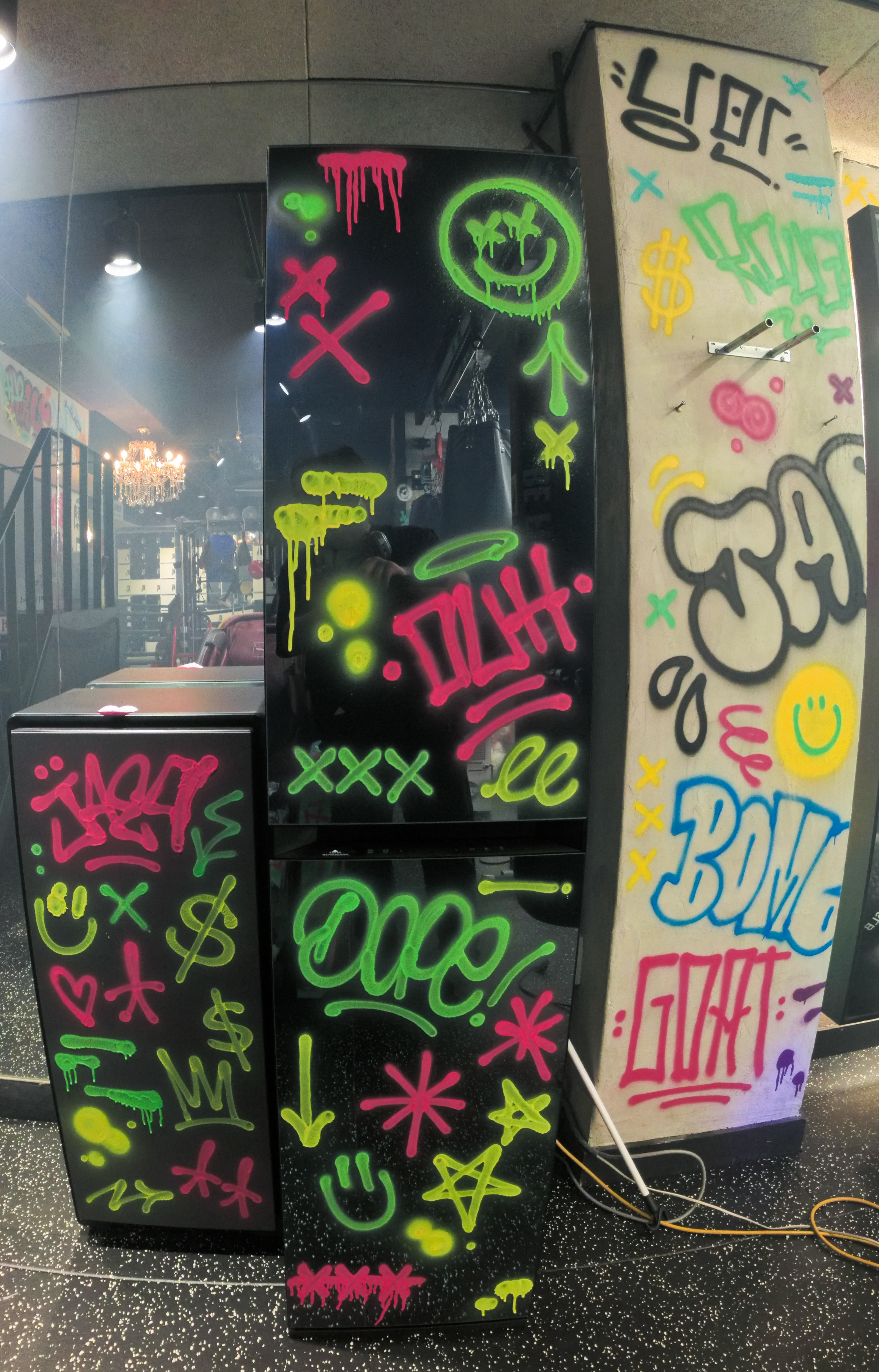 스타일러 유리면에는 포토존을 생각하며 형광 스프레이를 활용해 아트웍을 진행했습니다.