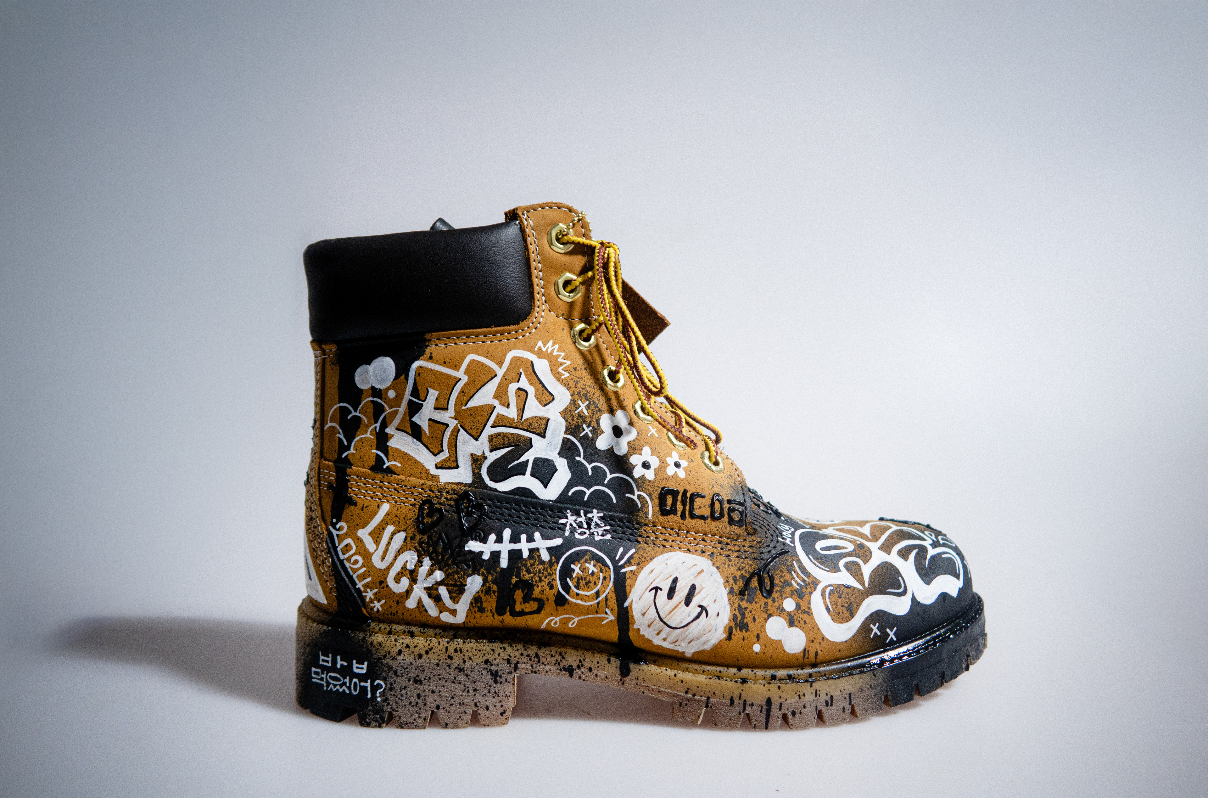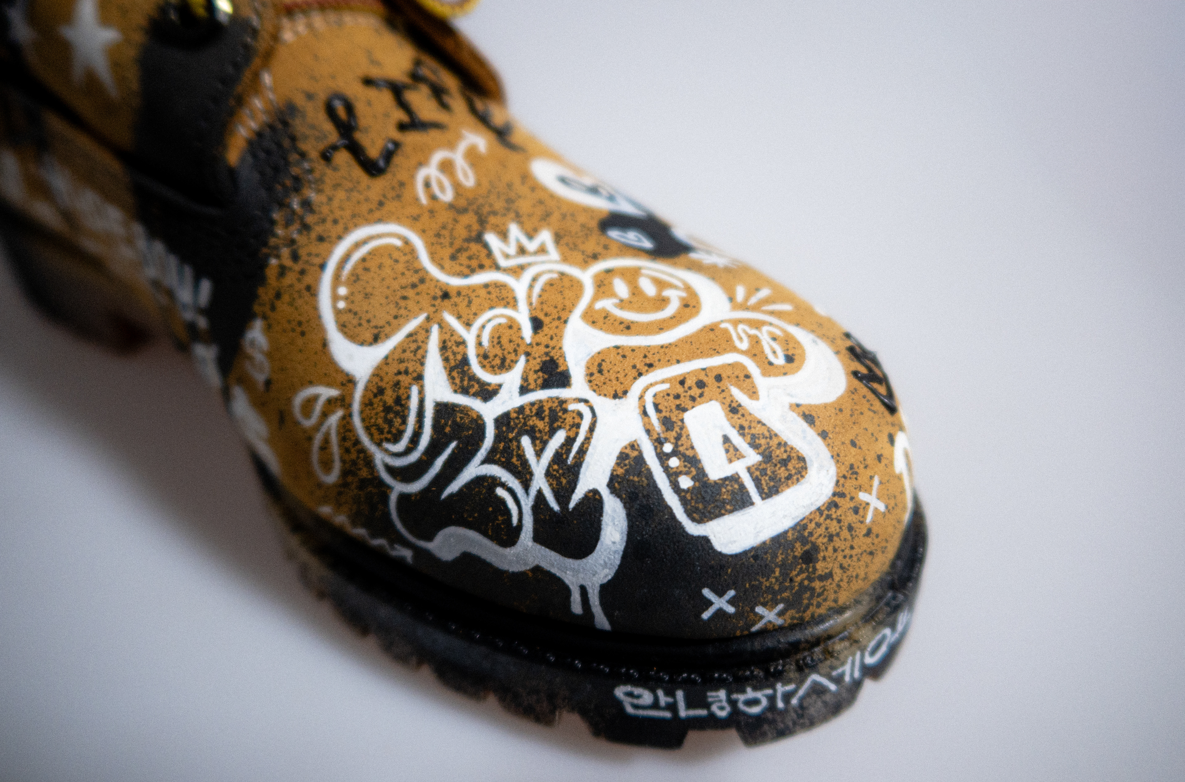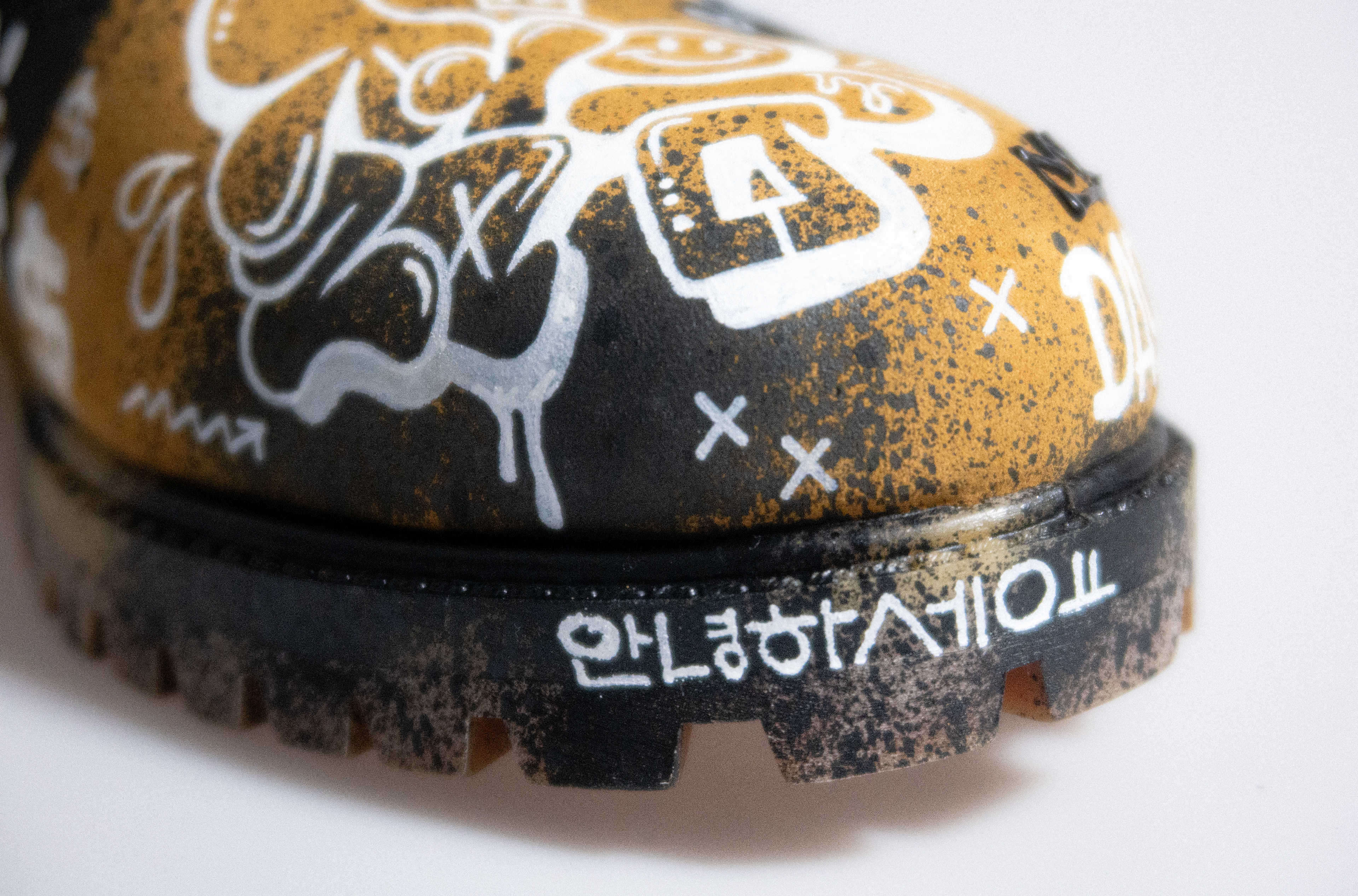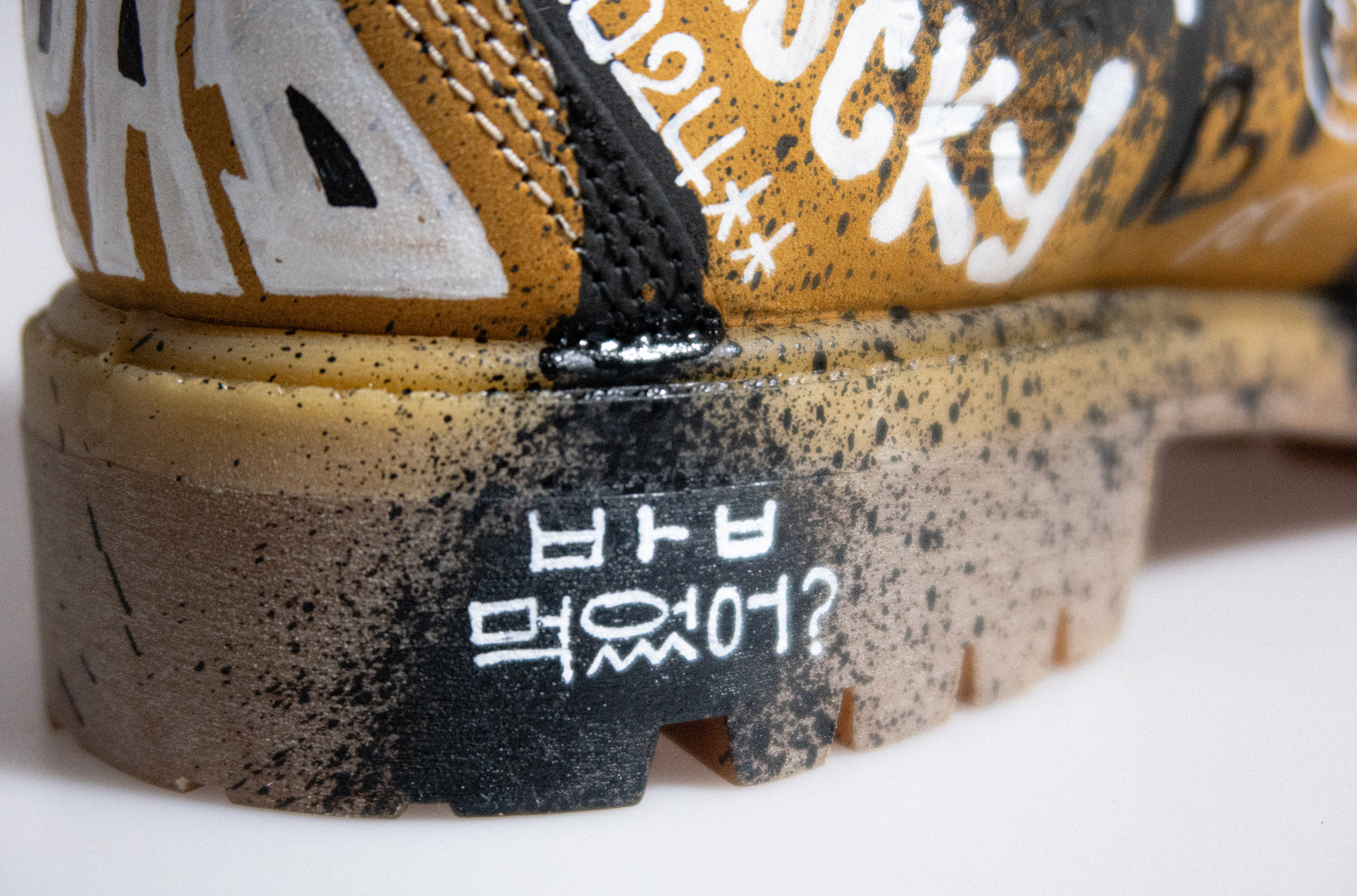 팀버랜드의 시그니처 옐로 부츠 위에 한글과 영어 두들링 아트웍을 진행했습니다.